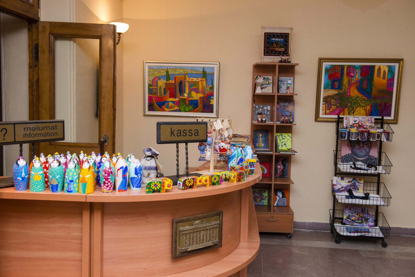 Muzey köşkü Muzey Mərkəzinin vestibül (dəhliz) zonasında yerləşir. Burada qonaqlar və sərgilərin iştirakçıları müxtəlif çeşidli süvenir mallar, o cümlədən:
