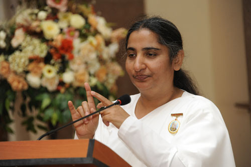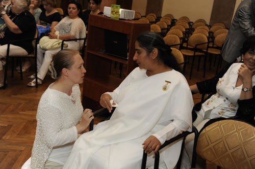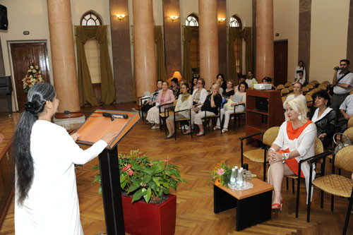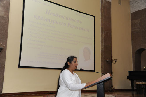 Рассказав об этимологии слова «культура» в языке хинди, Диди Сантош проиллюстрировала этим примером, что именно может служить объединяющим началом для разных культурных сообществ: «Нам нужно задаться вопросом о том, какова в принципе та культура, к которой мы хотим прийти. Должна быть ясна цель, лишь в этом случае мы можем предпринимать конкретные шаги к ее достижению. На хинди культура – это санскрити. То есть в первую очередь понятие культуры включает в себя аспект характера, темперамента, типа личности людей (так называемых санскар). Каковы санскары – такой будет и культура, санскрити. А какова культура, таким будет и мир, сансар. Санскары – это те врожденные свойства, наклонности, устремления, которые проявляются у меня всегда, независимо от того, в какой среде я нахожусь. Все мы, люди, очень разные, но в наших устремлениях имеется и нечто общее. Наша постоянная потребность, постоянное внутреннее стремление – это стремление к миру, счастью, любви для нас самих и для тех людей, которые нас окружают. Откройте любое писание, возьмите литературу, живопись, музыку, танец любой страны – во всем отражается именно это чувство! Мы можем говорить на азербайджанском, русском, английском или любом другом языке, но суть остается прежней: все мы хотим жить в мире, все мы хотим быть счастливыми. Когда мы начинаем сознавать себя как духовные, а не материальные сущности, мы способны почувствовать, что у каждого человека имеется внутри позитивная сердцевина. У каждого без исключения! Некоторые называют это божественным началом. Некоторые – врожденной чистотой. Это и есть чистая, истинная культура. Где бы мы ни оказались, эта позитивная внутренняя культура перемещается туда вместе с нами. Именно она становится основой для достижения единства среди многообразия.