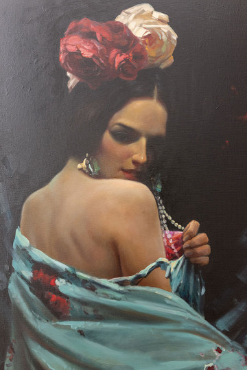 Своей кистью – посредником красоты и культуры, Вадуд Муаззин нежно гладит азербайджанским келагаем по лицу красивой азербайджанской женщины. Келагаи добавляет её образу элегантность, шепча о его бесконечном изяществе. Здесь келагаи – это не просто ткань, а живое свидетельство стойкого Духа Азербайджана.