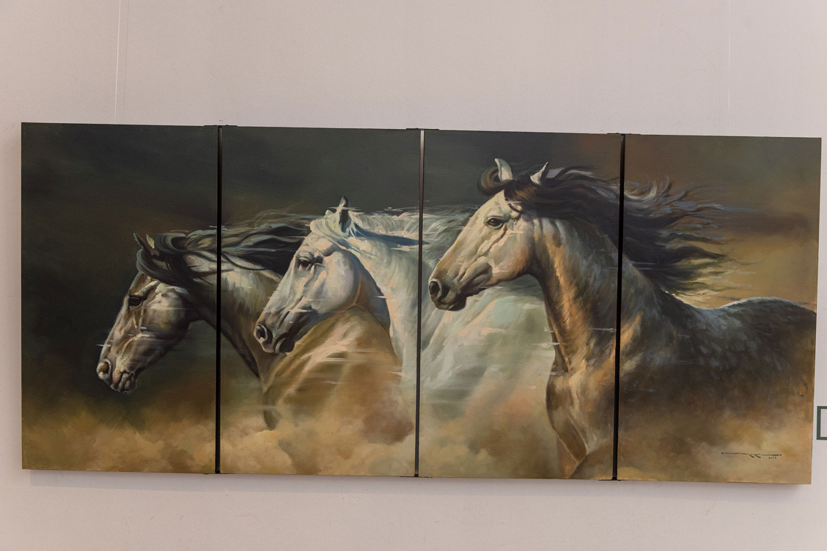 Непокорные лошади - неотъемлемая часть искусства Муаззина, их вечная элегантность и необузданная жизненная сила отражаются в ложащихся на холст мазках. Их великолепное изящество и необузданная свобода прекрасно проявляются в сюжетном исполнении, и приглашает нас путешествовать по дикой природе.